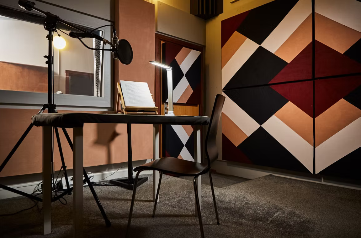 Gestalterische Einheit zwischen Büros und Aufnahmestudios durch abgestimmte akustische Elemente und individuelle Farbkonzepte.