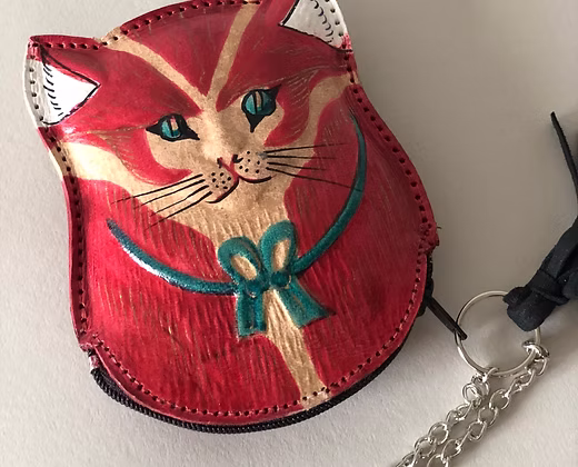 Das Portemonnaie wird aus Leder von Hand gefertigt und bemalt. Das charakteristische Katzenmotiv mit kräftigen Farben und feinen Details macht jedes Stück zu einem kleinen Designobjekt und zu einem besonderen Blickfang.