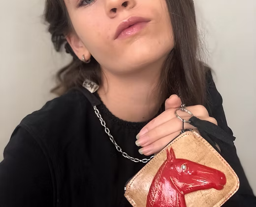 Handgefertigtes Hängeportemonnaie aus Leder mit Pferdmotiv. Gefertigt von Kunsthandwerkerfamilien in der Provinz Imbabura in Ecuador. Mit Metallkette und Band zum Umhängen – ein farbenfrohes Accessoire, das traditionelles Handwerk und verspieltes Design verbindet.