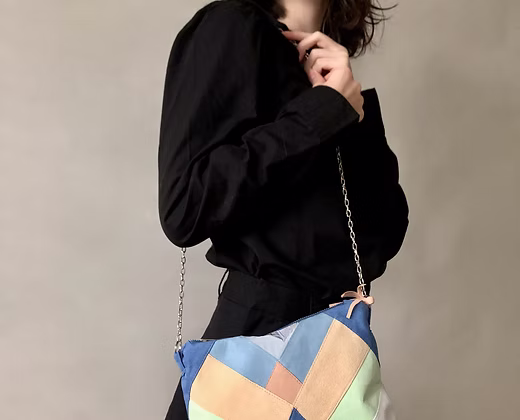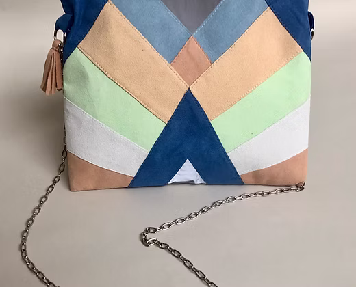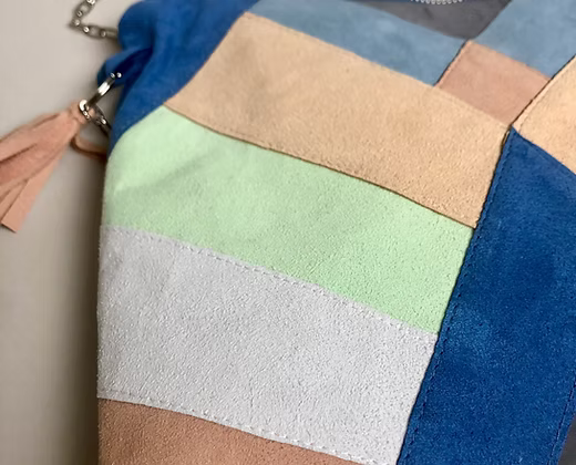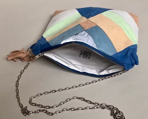 Handgefertigte Designer-Hängetasche aus Alcantara-Upcyclingmaterial. Die Iris-Tasche verbindet nachhaltige Materialtransformation mit grafischem Farbdesign. Durch die Kombination kräftiger Farbfelder und hochwertiger Materialien entsteht ein charakterstarkes Accessoire, das Funktionalität und zeitgenössisches Textildesign vereint. Jede Tasche ist ein kleines Unikat aus dem Atelier von Paola Kubes.