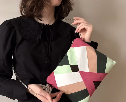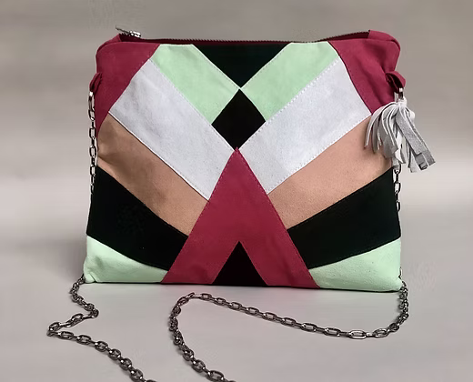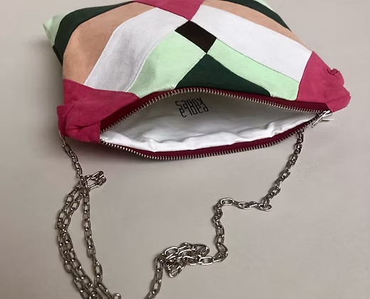 Handgefertigte Designer-Hängetasche aus Alcantara-Upcyclingmaterial. Die Iris-Tasche verbindet nachhaltige Materialtransformation mit grafischem Farbdesign. Durch die Kombination kräftiger Farbfelder und hochwertiger Materialien entsteht ein charakterstarkes Accessoire, das Funktionalität und zeitgenössisches Textildesign vereint. Jede Tasche ist ein kleines Unikat aus dem Atelier von Paola Kubes.