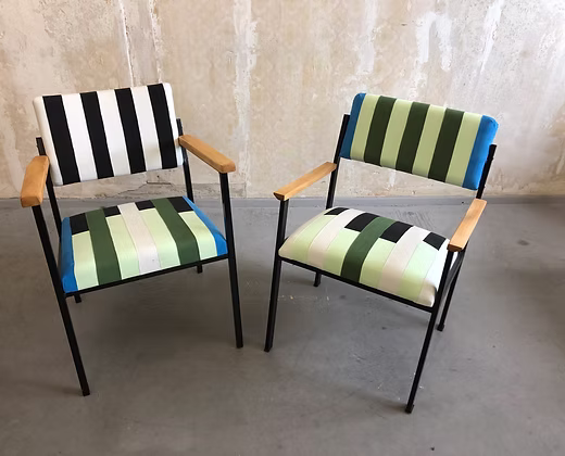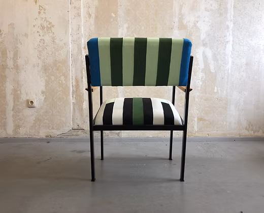 Das Metallgestell und die hölzernen Armlehnen wurden aufgearbeitet und die Posterung mit einem geometrischen Design erneuert. Als Material wurde Alcantara verwendet, dass sich durch eine hohe Weichheit, Elastizität, Strapazierfähigkeit und Reinigungsfreundlichkeit auszeichnet.