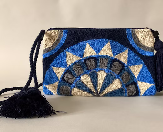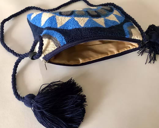 Handgefertigte Schultertasche aus Wolle mit farbenfrohen Mustern. Gefertigt von Handwerkerfamilien in Kolumbien und mit wasserabweisendem Innenfutter ausgestattet. Ein charakterstarkes Accessoire, das traditionelles Kunsthandwerk mit modernem Design verbindet.