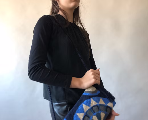 Die Tasche wird aus Wolle handgewebt und überzeugt durch ihre besondere Struktur und lebendige Farbkomposition. Dadurch entsteht ein Accessoire mit individuellem Charakter, das sowohl funktional als auch dekorativ ist.