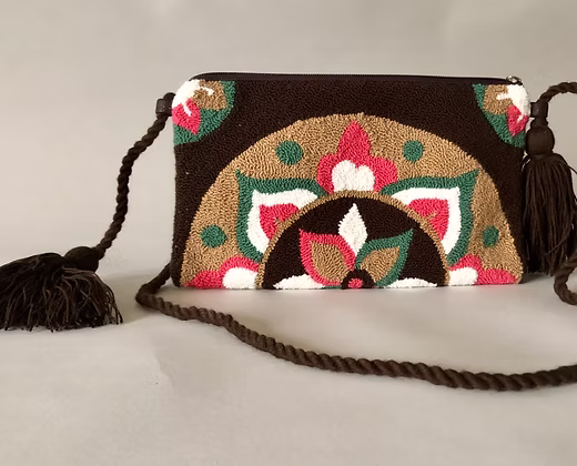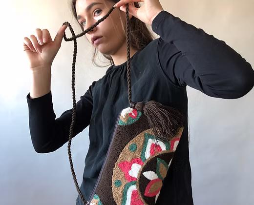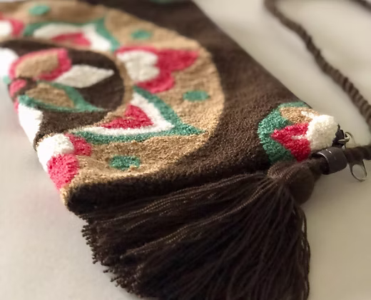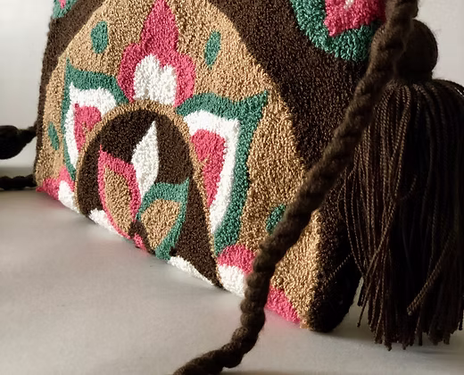 Handgefertigte Schultertasche aus Wolle mit farbenfrohen Mustern. Gefertigt von Handwerkerfamilien in Kolumbien und mit wasserabweisendem Innenfutter ausgestattet. Ein charakterstarkes Accessoire, das traditionelles Kunsthandwerk mit modernem Design verbindet.